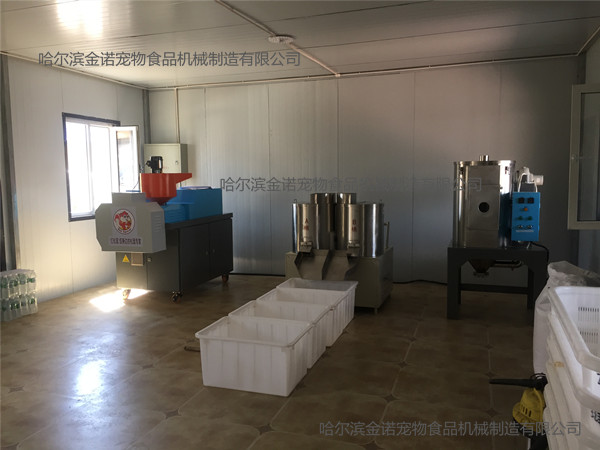 狗糧加工設備JNK200-T5M:1。JNK200-T5M型狗糧加工設備安裝方便、出廠已經試機,狗糧機切刀采用直角切刀技術,調試簡單;2。狗糧設備的主軸和切刀小軸均可隨時注入耐高溫潤滑脂,延長狗糧機的軸承使用壽命;3。JNK200-T5M狗糧設備每小時生產狗糧顆粒200公斤。
